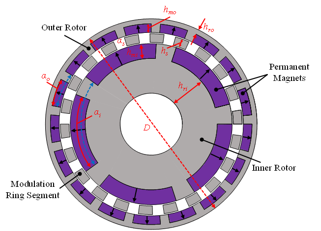 The CP-CMG configuration consists of an inner rotor, a stationary ferromagnetic modulation ring, and an outer rotor. Both rotors employ a consequent-pole topology in which all permanent magnets on a given rotor are magnetized in the same radial direction, while intermediate ferromagnetic segments complete the magnetic circuit. The magnetization direction is uniform within each rotor but opposite between the two rotors: the outer rotor magnets are radially inward magnetized, whereas the inner rotor magnets are radially outward magnetized.
