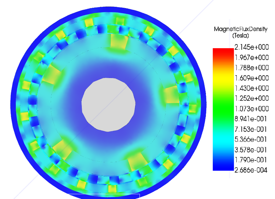 Localized regions in the modulation segments and rotor back irons reach flux density levels close to or above magnetic saturation. These saturated zones occur primarily at magnet–steel interfaces and at the tips of the modulation segments, where flux is concentrated and redirected across the air gap. Saturation limits further increase in local flux density and alters the effective permeance of the magnetic circuit.