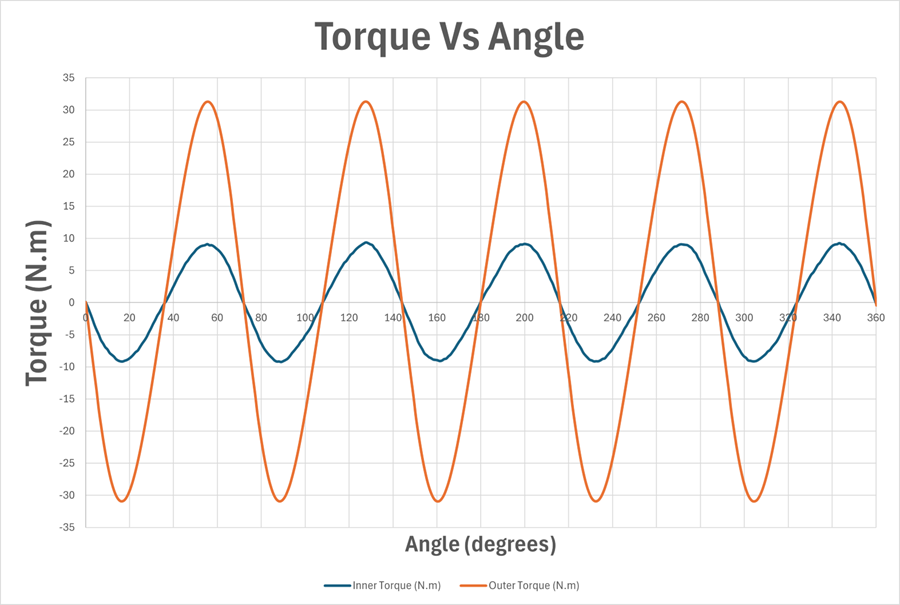 Both inner and outer torque waveforms are highly sinusoidal over the full 0–360° sweep, with consistent zero crossings, extrema, and symmetry. This indicates that torque transmission is dominated by fundamental space harmonic, with very low harmonic distortion. The maximum quasi-static torque reaches approximately 9.2–9.3 N·m on the inner rotor and 31.2–31.3 N·m on the outer rotor, and these values repeat consistently over each electrical period.