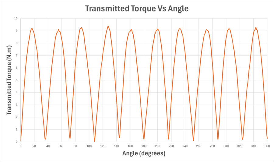 Plotting $$ \Delta\theta_{\text{pullout}} \approx 128^\circ $$ as a function of ∆θ yields a periodic torque–angle characteristic reflecting the magnetic symmetry of the gear. The pull-out torque is defined as the maximum value of this curve,