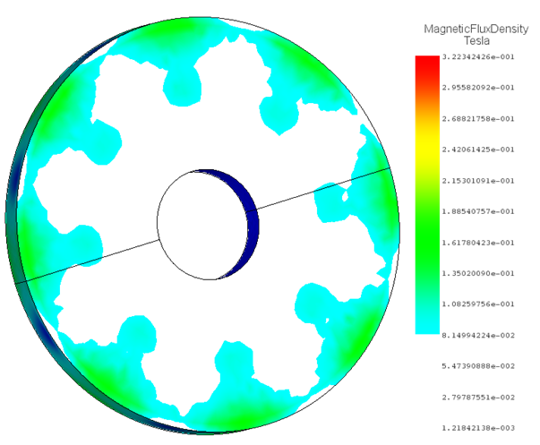 Transient magnetic analysis in EMWorks for Inventor plays a crucial role in visualizing the temporal evolution of magnetic fields. This analysis provides a clear picture of how magnetic fields change over time, which is vital for optimizing the design and functionality of magnetic devices. Figure 7 illustrates the spatial distribution of magnetic flux density within the permanent magnet and the disk.