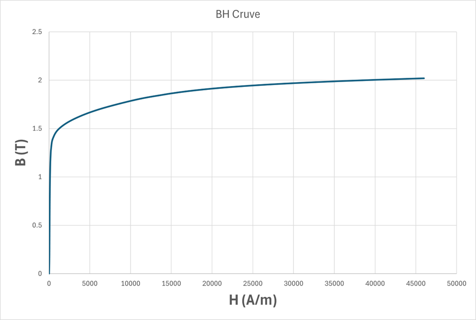 The yoke and plunger are modeled using non-oriented electrical steel M310-50A. A nonlinear B–H curve, shown in Figure 4, is used to capture saturation effects in regions of high flux density, particularly near air gaps and corners. Using a nonlinear steel model is required to correctly predict how reduced excitation shifts the operating point on the B–H curve and affects force.