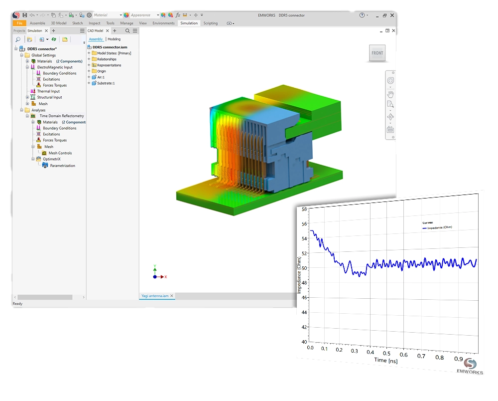 TDR in EMWorks simuliert, wie eine schnelle Flanke entlang von Übertragungsleitungen, Leiterbahnstrukturen auf PCBs, Kabeln und Steckverbindern läuft und wie sie an Impedanzänderungen reflektiert wird. Ausgehend von einem einzigen 3D-Modell können Sie die TDR-Wellenform visualisieren, das Impedanzprofil entlang der Strecke extrahieren und Diskontinuitäten, Stubs, Unterbrechungen, Kurzschlüsse oder schlecht angepasste Übergänge schnell lokalisieren.